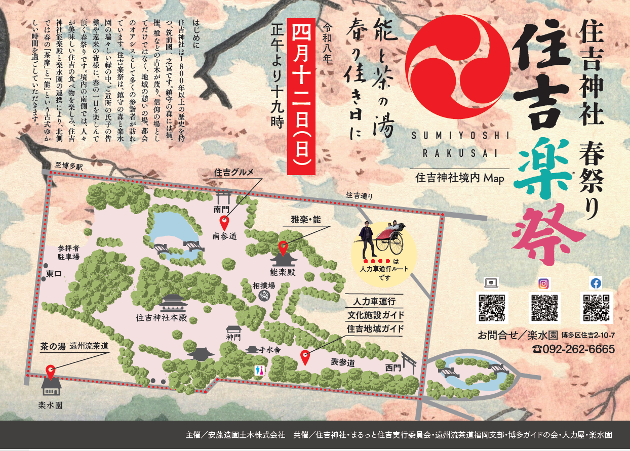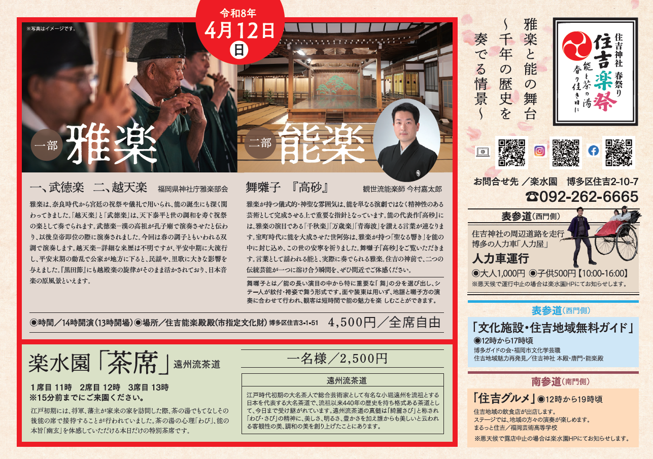 住吉楽祭は住吉神社と楽水園の連携による、春の茶席と雅楽・能の舞台を開催いたします。