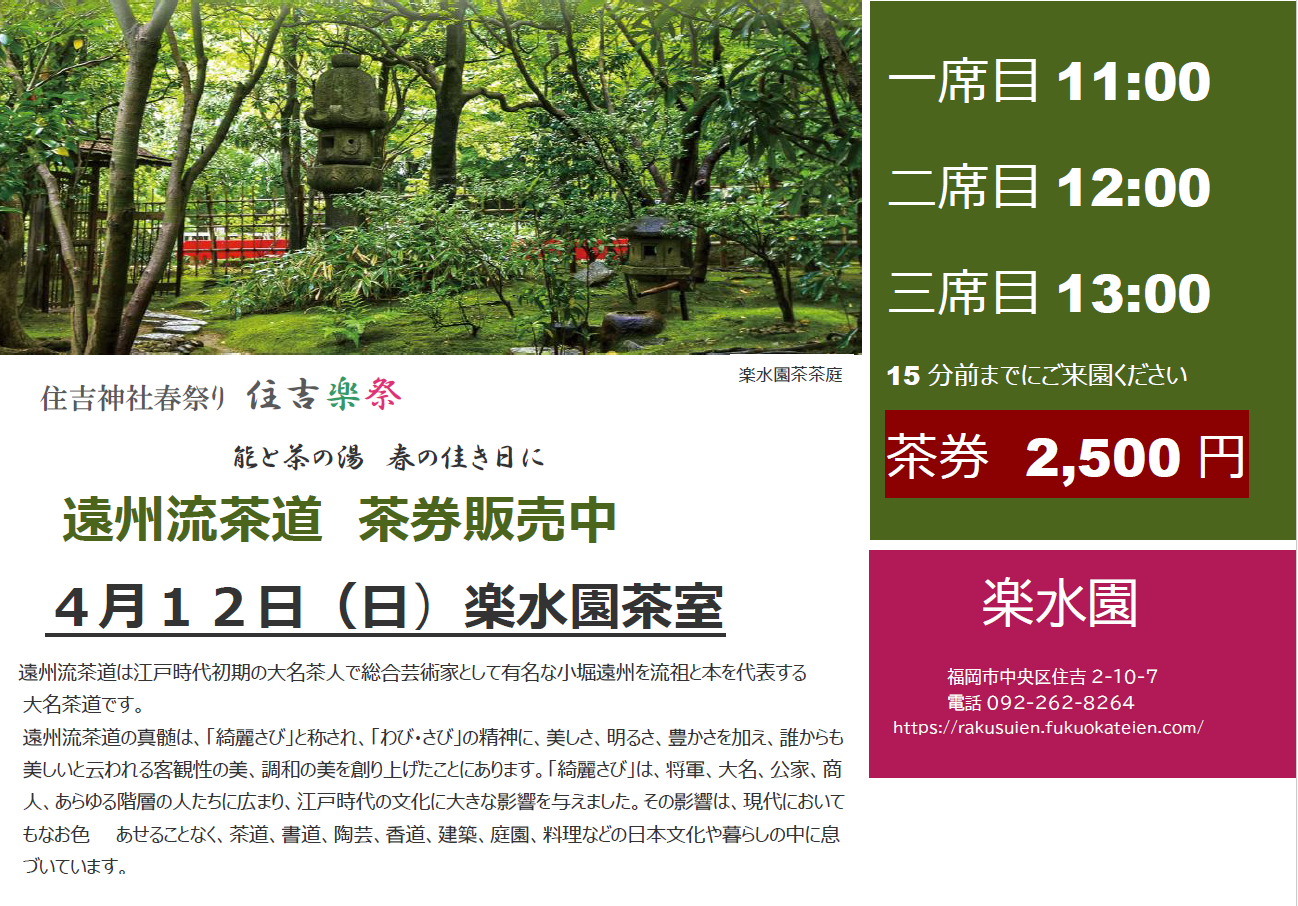 2026年4月12日(日) 『雅楽』と『能楽』の舞台・楽水園『茶席』予約販売中です。