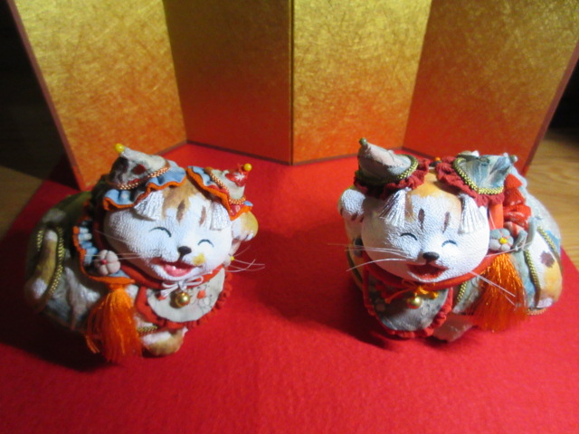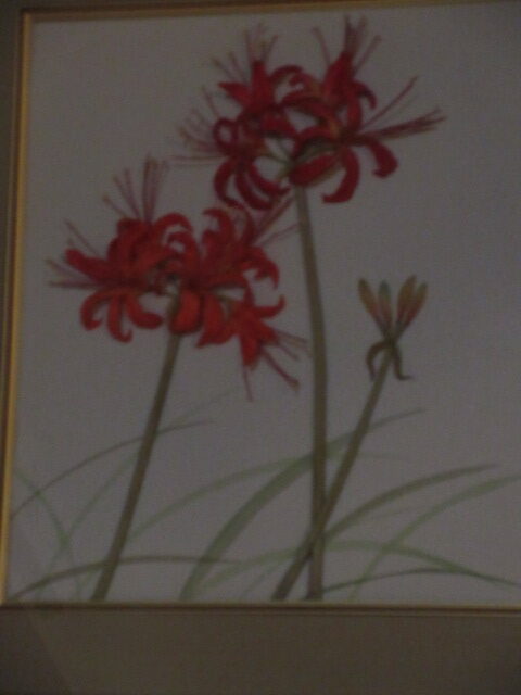 曇り空の一日… 皆さま、いかがお過ごしでしょうか 庭全体は、しっとりとしています。 飾り棚には、幸せな猫ちゃんたち…いい笑顔でしょ❣ 皆さまへ幸せあれ~ 額縁はヒガンバナです… 床の間には、イソハナビ・キンビズヒキ・シロハギ等、秋の花が入りました