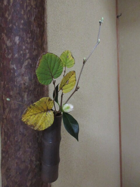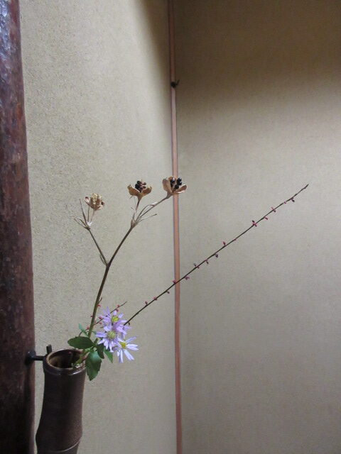 床の間の掛花入れには、ツバキとトサミズキ。ヌバタマ、ミズヒキソウ、ノコンギクです。