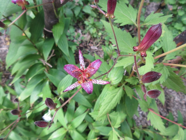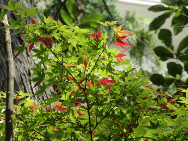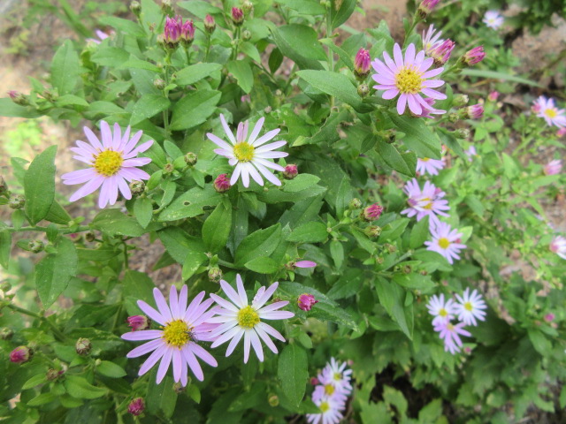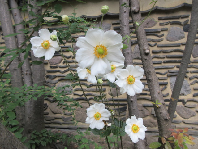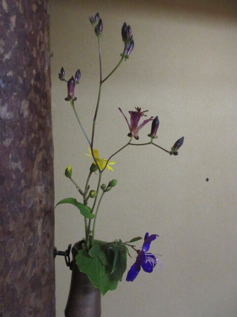 暖かい一日ですが、暦の上では、冬の始まる頃。 立冬に入りました。 皆さま、おかわりございませんか… 木々の上の方がかすかに色をつけていますが、まだまだです さて、裏庭には白いシュウメイギクや紫のホトトギス、可愛らしい菊のノコンギクが盛んに咲いています。 床の間の掛花入れに、ホトトギス・ツワブキ・ノボタンが 入りました。 茶室でのんびりしませんか…